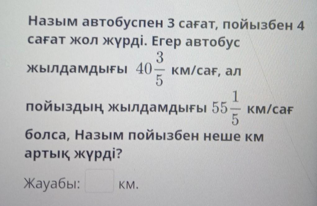 Назым автобуспен 3 сағат, пойызбен 4 сағат жол жүрді. Егер автобус 3 жылдамдығы 40 3/5 км/сағ,ал пойыздың жылдамдығы 55 1/5 км/сағ болса, Назым пойызбен неше км артық жүрді?