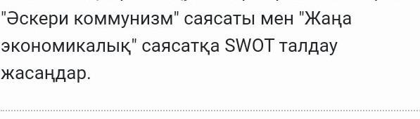«Соғыс коммунизмі» және «Экономикалық» саясаттары үшін SWOT талдауы (күшті, әлсіз жақтарын, мүмкіндіктер мен қауіптерді талдау) келесідей болуы мүмкін: