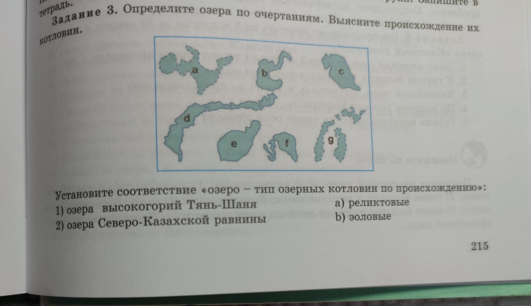тетрадь. Задание 3. Определите озера по очертаниям. Выясните происхождение их 20929 22997/9-200 КОТЛОВИН. Cocoo 60 d H Установите соответствие озеро 1) озера высокогорий Тянь-Шаня 2) озера Северо-Казахской равнины cr90 do esto - b забе HORIA 1 woyor o тип озерных котловин по происхождению»: a) реликтовые b) эоловые 1 215