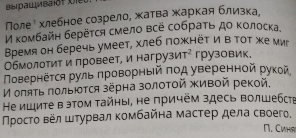 Поле хлебное созрело, жатва жаркая близка, И комбайн берётся смело всё собрать до колоска. Время он беречь умеет, хлеб пожнет и в тот же миг Обмолотит и провеет, и нагрузит2 грузовик. Повернётся руль проворный под уверенной рукой, Не ищите в этом тайны, не причём здесь волшебство - И опять польются зёрна золотой живой рекой. Просто вëл штурвал комбайна мастер дела своего. П. Синявский 1 • Выпиши словосочетания прилагательное+существительное помогите пожалуйста