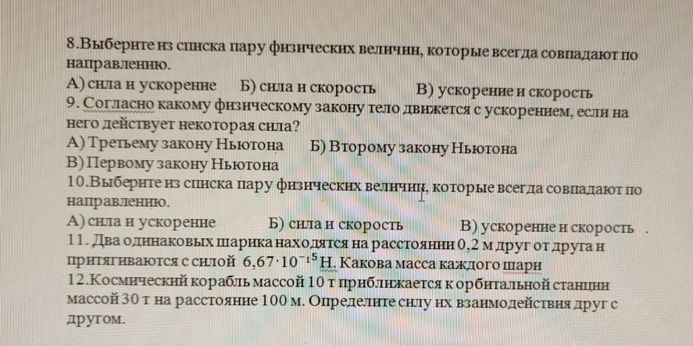 8.Выберите из списка пару физических величин, которые всегда совпадают по направленню. А) сила и ускорение Б) сила и скорость В) ускорение и скорость 9. Согласно какому физическому закону тело движется с ускорением, если на него действует некоторая сила? А) Третьему закону Ньютона Б) Второму закону Ньютона В) Первому закону Ньютона 10. Выберите из списка пару физических величин, которые всегда совпадают по направлению. А) сила и ускорение Б) сила и скорость В) ускорение и скорость 11. Два одинаковых шарика находятся на расстоянии 0.2 м друг от друга и притягиваются с силой 6,67.10-15 Н. Какова масса каждого шари 12.Космический корабль массой 10 т приближается к орбитальной станции массой 30 т на расстояние 100 м. Определите силу их взаимодействия друг с ДРУГОМ.