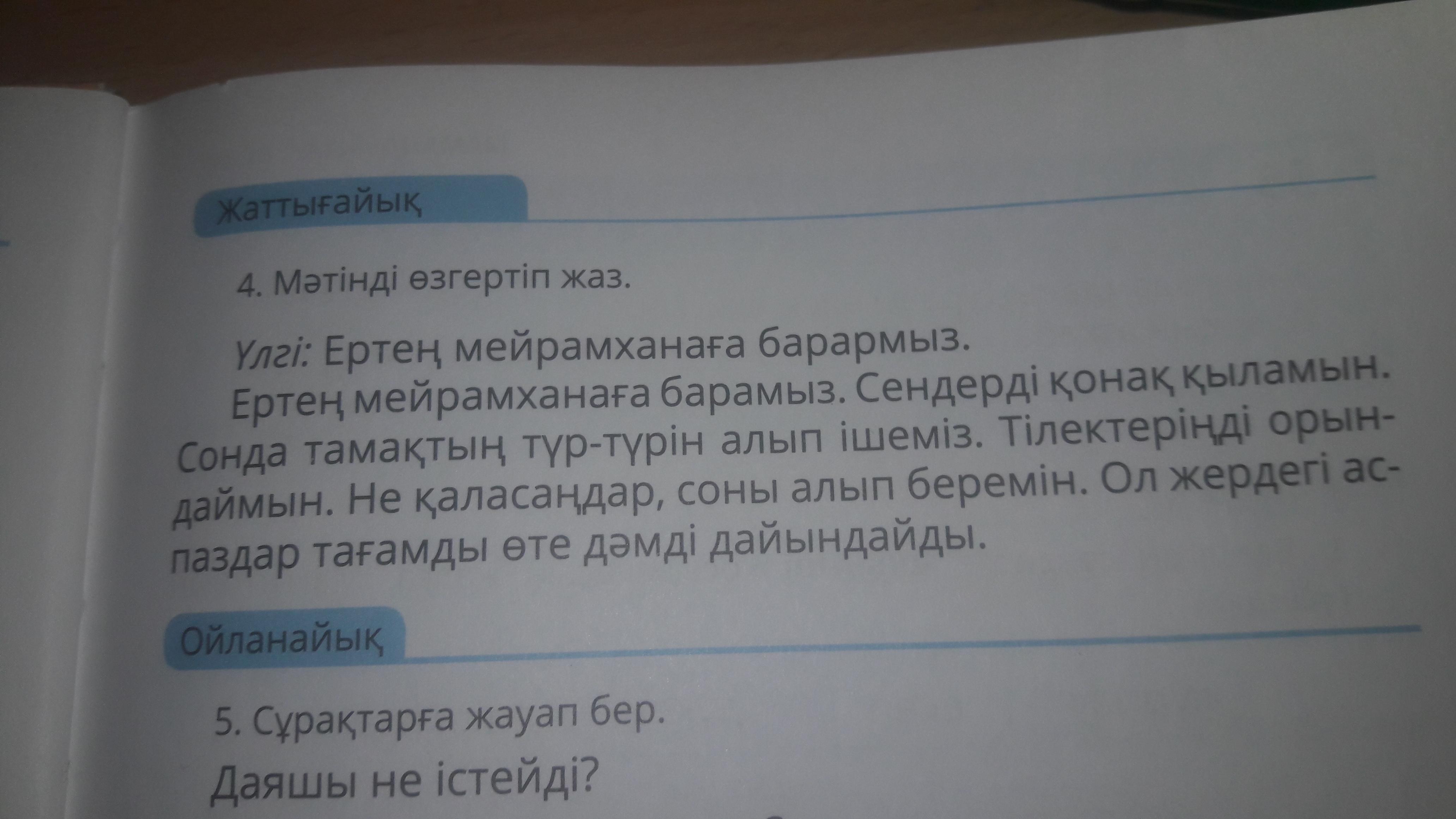 Ответ:Мейрамханаға ертең барамыз. Қонақ қыламын сендерді. Тамақтың түр түрін сонда алып ішеміз.Орындаймын тілектеріңді.Алып беремін не қаласаңдар соны. Тағамды ол жердегі аспаздар өте дәмді дайындайды.