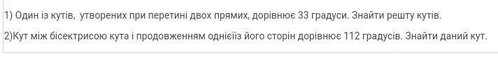 1) Один із кутiв, утворених при перетині двох прямих, дорівнює 33 градуси. Знайти решту кутів. 2)Кут між бісектрисою кута і продовженням однієї з його сторiн дорівнює 112 градусів. Знайти даний кут.
