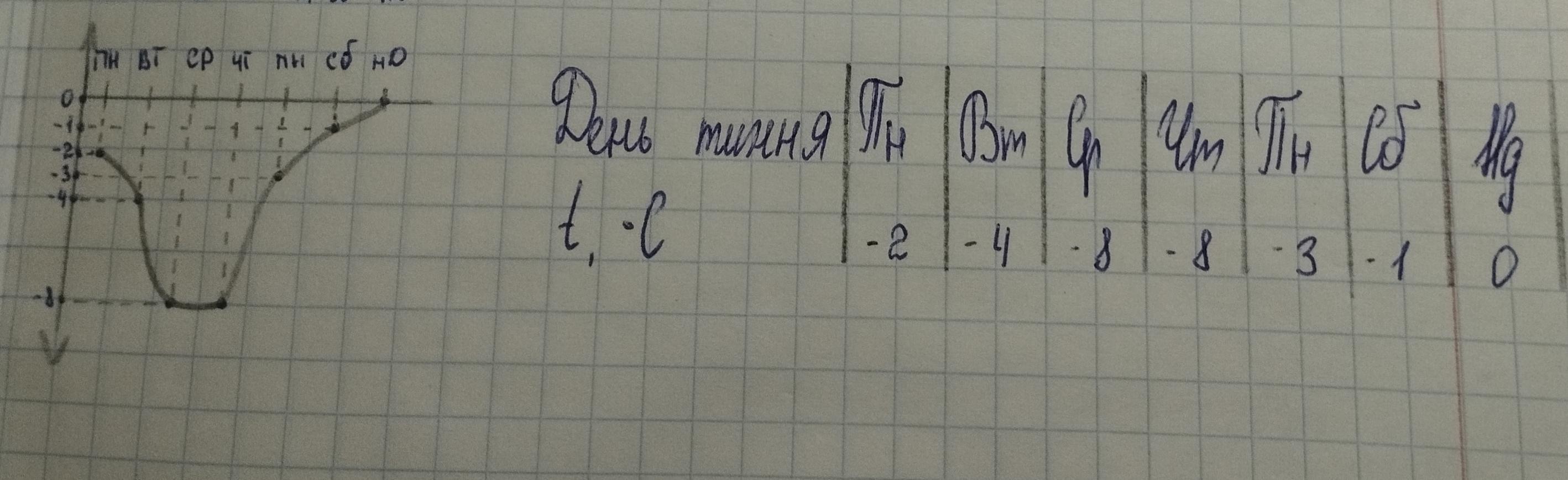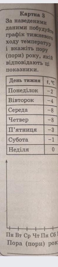 За наведеними даними побудуйте графік тижневого ходу температур і вкажіть пору (пори) року, якій відповідають ці показники. День тижня Понеділок -2 Вівторок -4 Середа -8 Четвер -8 П'ятниця -3 Субота -1 Недiля 0 Пн Вт Ср Чт Пн сб Пора (пори) рок