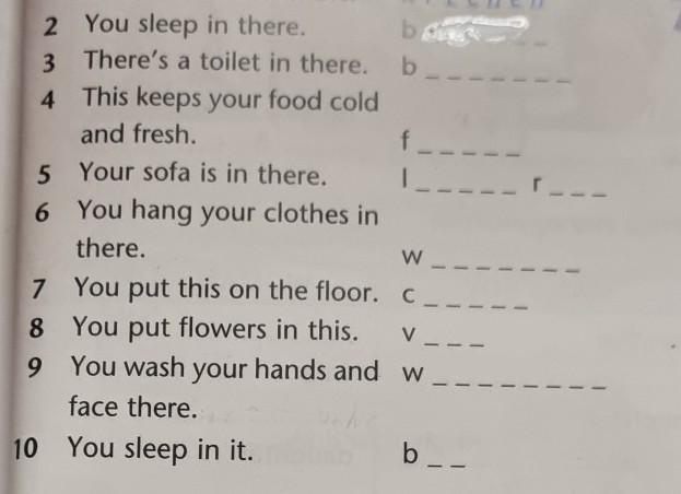 1 2 3 4 5 6 Read the descriptions below and fill in the gaps with the correct word. There's a cooker in ther. &itchen You sleep in there. be There's a toilet in there. b This keeps your food cold and fresh. Your sofa is in there. You hang your clothes in there. I_. W You put this on the floor. c 7 8 You put flowers in this. V 9 You wash your hands and w face there. 10 You sleep in it. b__