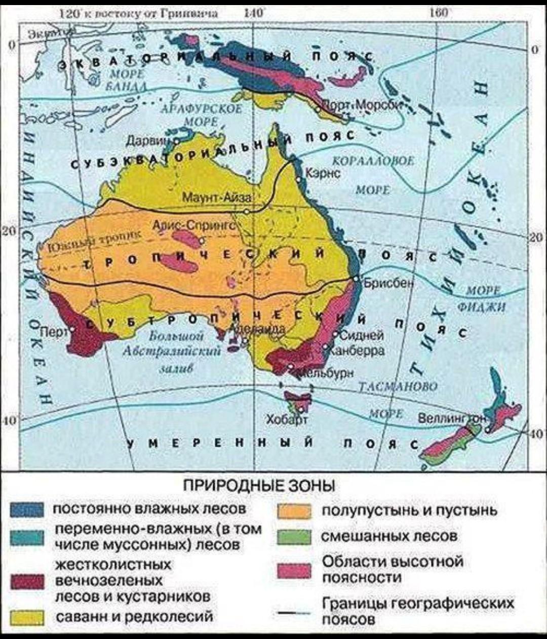Австралия расположена в субэкваториальном, тропическом и субтропическом климатических поясах. Из-за различного географического положения области климата отличаются друг от друга.Так, субэкваториальный климат наблюдается в северной части материка. Здесь круглый год высокие температуры: в январе и июле около +24°. Очень влажно (около 1000-2000 мм осадков). Субэкваториальный климат имеет две области:влажный на востоке (в январе +15°, в июле +24°, среднегодовое количество осадков 1000-1500 мм) и сухой на западе ( в январе +15°, в июле +24°, среднегодовое количество осадков около 200 мм). И в субтропическом климате можно выделить несколько климатических областей:средиземноморский тип на юго-западе (в январе +8°, в июле +22°, осадков около 500 мм), в центральной части континентальный (в январе +6°, в июле +24°, количество осадков около 250 мм) и на юго-востоке влажный субтропический (в январе +8°, в июле +22°, количество осадков около 2000 мм).