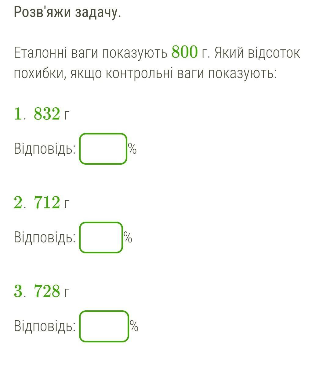 Еталонні ваги показують 800 г. Який відсоток похибки, якщо контрольні ваги показують: 1) 832 г Відповідь: % 2) 712 г Відповідь: % 3) 728 г Відповідь: %