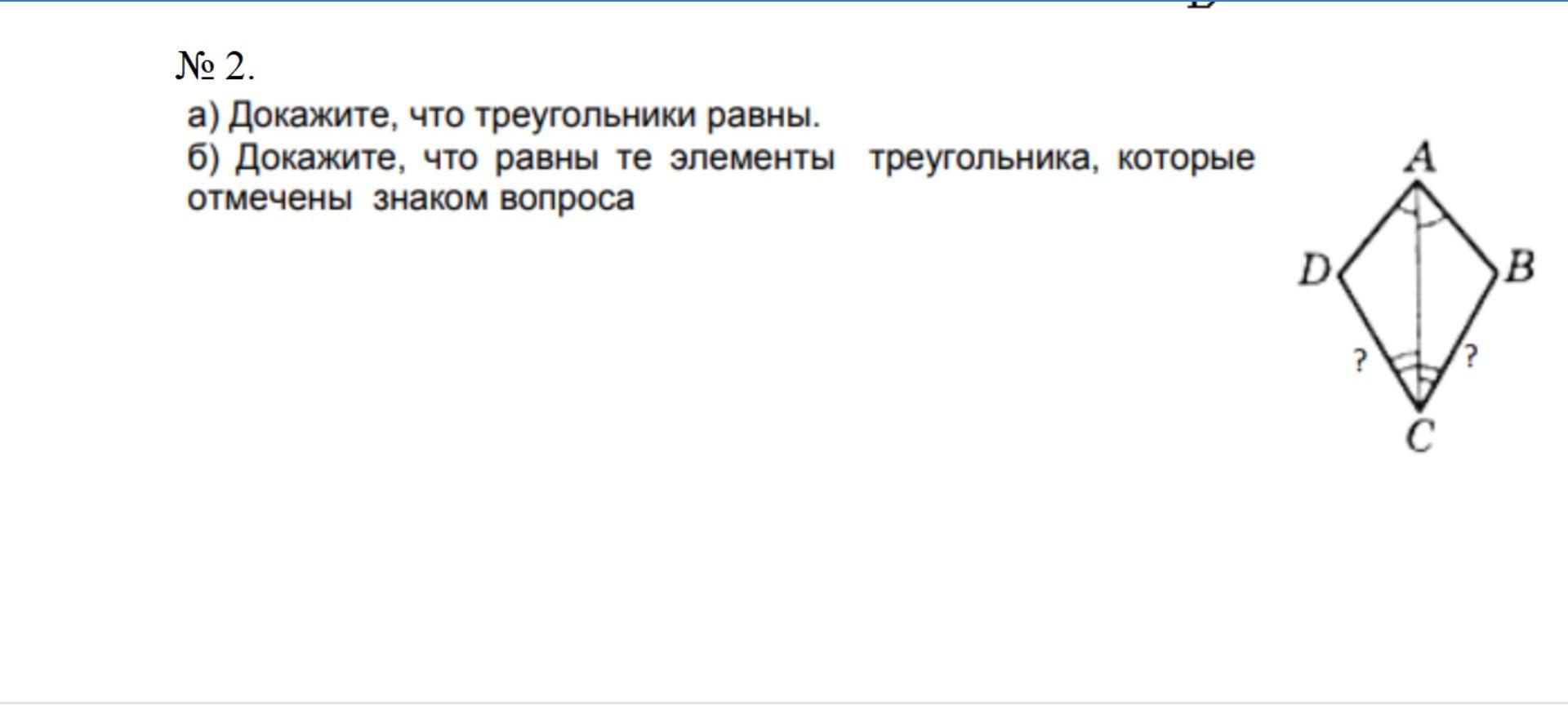№ 2. а) Докажите, что треугольники равны. б) Докажите, что равны те элементы треугольника, которые отмечены знаком вопроса D ? ? B