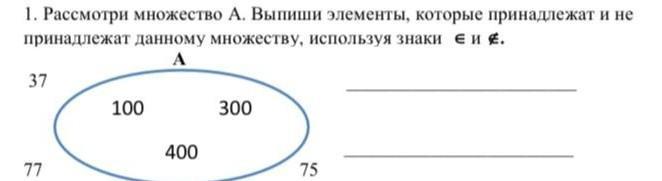 1. Рассмотри множество А. Выпиши элементы, которые принадлежат и не принадлежат данному множеству, используя знаки е и . A 37 77 100 400 300 75 все баллы дам пожалуйста помогите