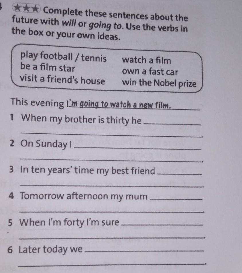 *** Complete these sentences about the future with will or going to. Use the verbs in the box or your own ideas. play football/tennis be a film star visit a friend's house This evening I'm going to watch a new film. 1 When my brother is thirty he 2 On Sunday I watch a film own a fast car win the Nobel prize 3 In ten years' time my best friend 4 Tomorrow afternoon my mum 5 When I'm forty I'm sure 6 Later today we