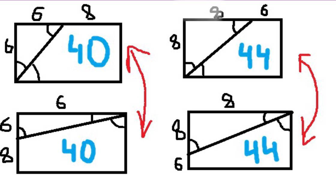 Попробуем провести не к длине,а к ширине прямоугольника биссектрису... как видим на рисунок ничего не поменялось..по сути мы просто перевернули прямоугольник..отсюда есть только 2 способа решения данной задачи