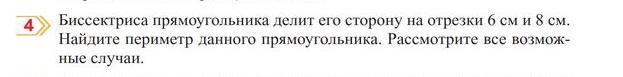 Проведем бисектрису. 90:2=45 каждая половинка прямого угла. Рассмотрим прямоугольный треугольник. 90-45=45 градусов второй его угол,значит треугольник равнобедренный. у нас два случая: когда первая половинка стороны 6см, другая 8см. и наоборот. одна 8 см, другая 6 см. В зависимости от такой последовательности будет меняться сторона прямоугольника.