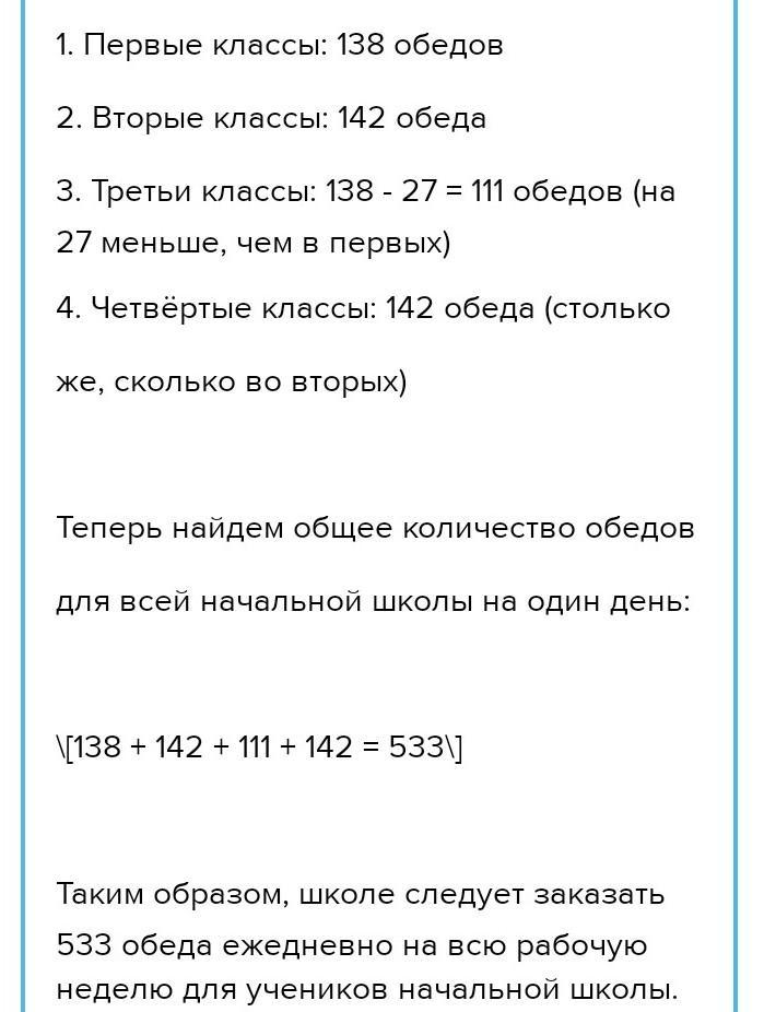 5. Ученикам начальной школы ежедневно привозят обеды. В первых классах учатся 138 человек, во вторых 142 человека, в третьих на 27 человек меньше, чем в первых, а в четвёртых столько же, сколько во вторых классах. Сколько обедов школа должна заказать на всю рабочую неделю?