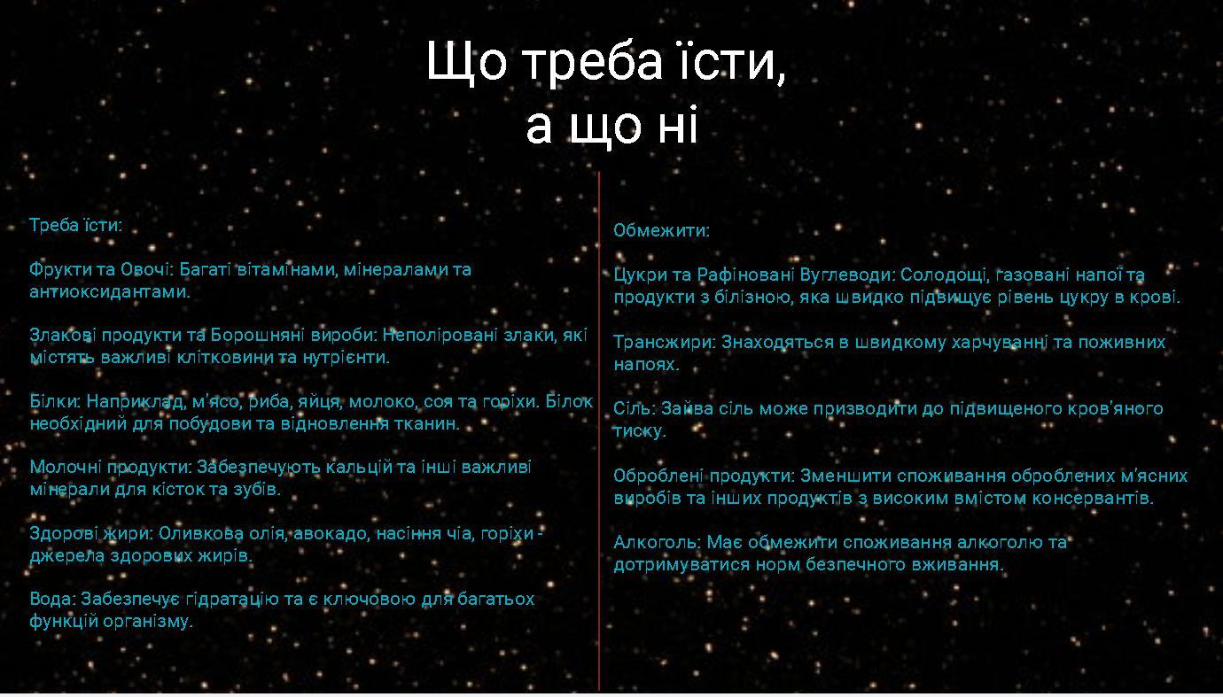 Для здоров'я потрібно вживати фрукти, овочі, молочні продукти різні вітаміни і т.д. що не потрібно вживати дуже багато для людини це хімія наприклад ( чіпси, сухарики, і т.д.) взагалі хімію можна вживати але не так багато тому що можуть бути великі проблеми зі шлунком.