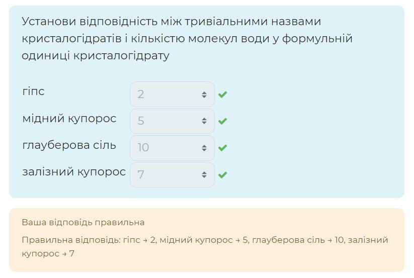 Установи відповідність між тривіальними назвами кристалогідратів і кількістю молекул води у формульній одиниці кристалогідрату