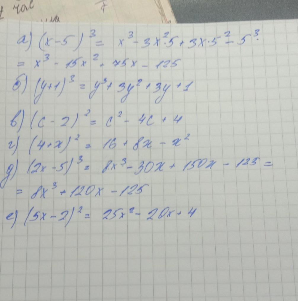 Подай вираз у вигляді многочлена. |a) (x - 5)3 = (y + 1)3 = б) B) (c - 2)2 = г) (4 + x)2 = д) (2х - 5)3 = e) (5x - 2)2 =