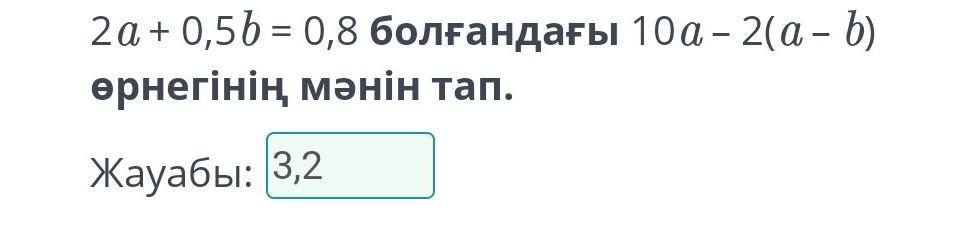 X Ұқсас қосылғыштар. Ұқсас қосылғыштарды біріктіру. 2-сабақ 2a+0,5b = 0,8 болғандағы 10a-2(a-b) өрнегінің мәнін тап. Жауабы: