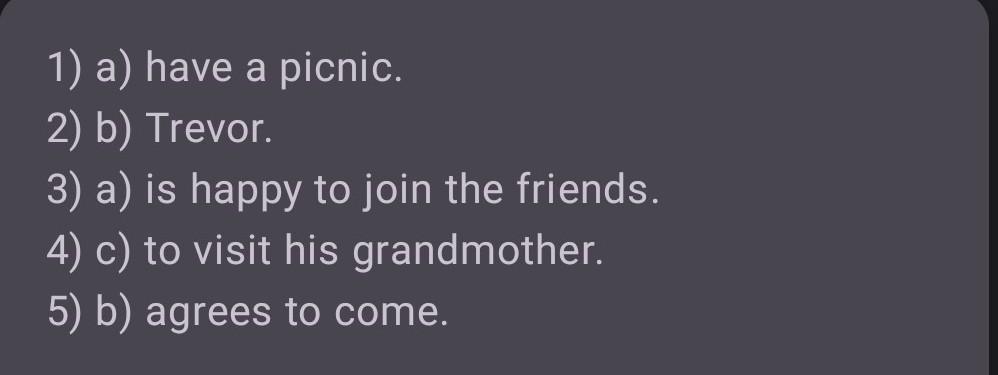 1 Listen to the conversation, read the statements and circle the correct answer. (5 points max.) 1 On Sunday, Nevita and Robert are going to ... a) have a picnic. b) go shopping. c) visit their grandmothers. 2 Who invites Rachel to join them? a) Robert b) Trevor c) Nevita 3 Rachel... a) is happy to join the friends. b) is sorry she can't join the friends. c) needs time to think about it. 4 At first Trevor says he can't come because he has ... a) to do some shopping. b) to bring chicken and salad. c) to visit his grandmother. 5 In the end Trevor ... a) says he still can't come. b) agrees to come. c) says he'll try to come