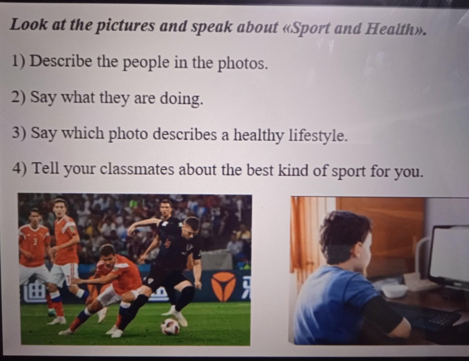 On the left picture you can see several football players,meanwhile on the other picture there is a boy supposedly using a computer. You cant judge by 1 picture,but its clear that football players must have a very healthy lifestyle to obtain a lot of energy for matches. The boy on the right picture looks like an ordinary boy with an average lifestyle that doesnt seem to be so special. (4 пункт кто спорт который подойдет больше вам,я напишу свой любимый но можно вместо этого вставить любой другой) I prefer volleyball as it is very simple as a hobby. I am pretty solid at it although I find it as a hobby rather than taking it professionally.