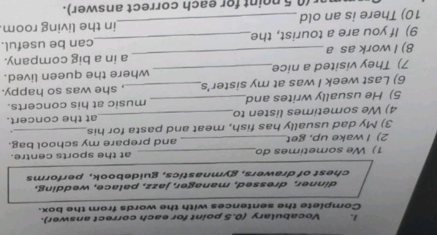 Vocabulary (0.5 point for each correct answer). Complete the sentences with the words from the box. dinner, dressed, manager, jazz, palace, wedding, chest of drawers, gymnastics, guidebook, performs