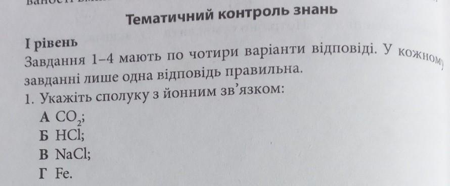Тематичний контроль знань І рівень Завдання 1-4 мають по чотири варіанти відповіді. У кожному завданнi лише одна вiдповiдь правильна. 1. Укажіть сполуку з йонним зв'язком: A CO₂; Б НСl; B NaCl; I Fe.