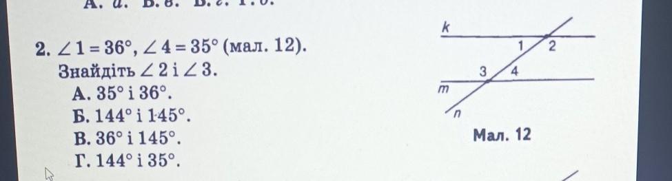 2.1=36°, 24 = 35° (мал. 12). Знайдіть < 2iZ3. А. 35° i 36°. Б. 144° i 145°. B. 36° i 145°. Г. 144° i 35°. m m 4 Мал. 12