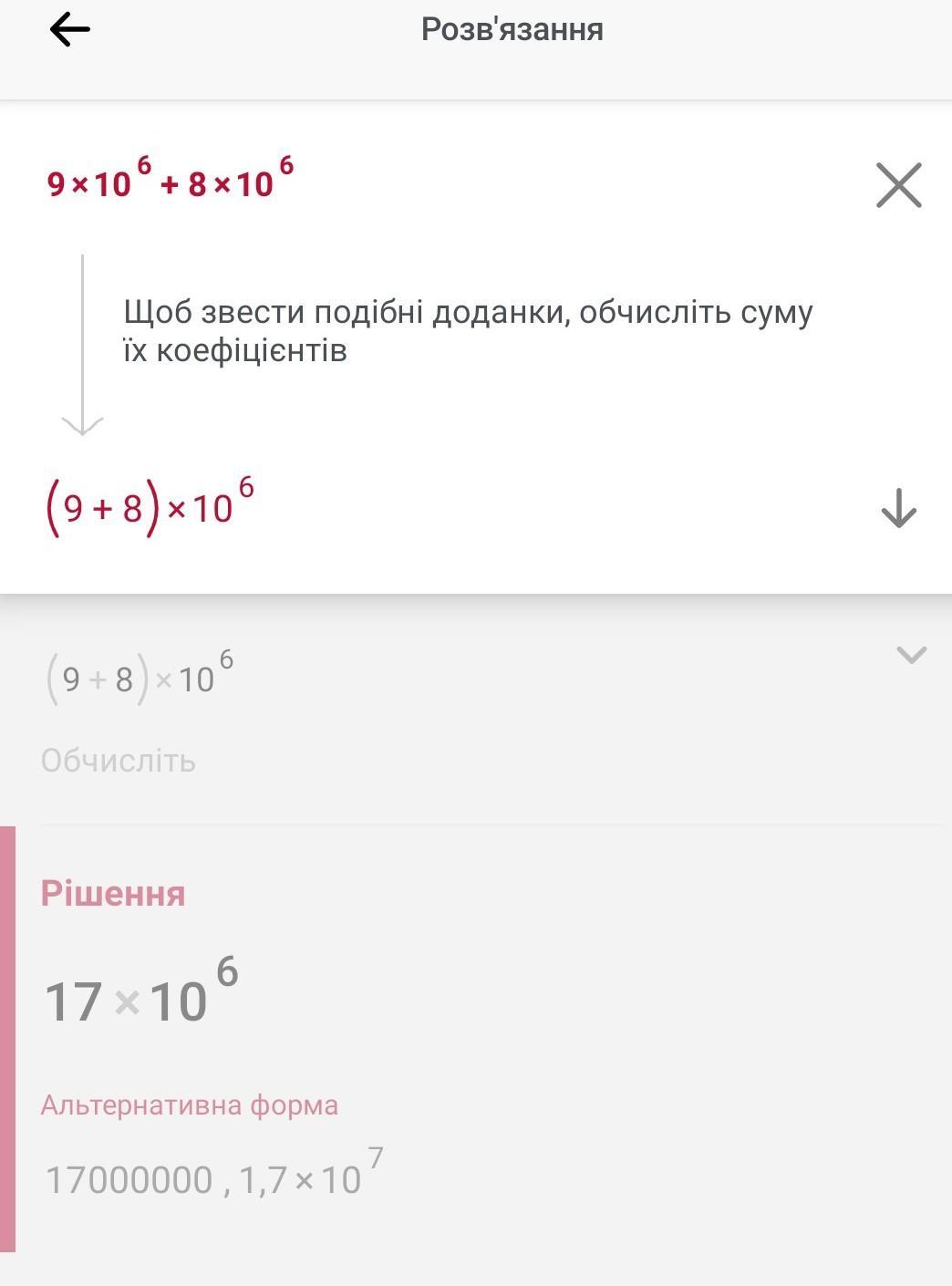 9•10⁶+8•10⁶=(9+8)•10⁶=17•10⁶=1,7•10¹•10⁶=