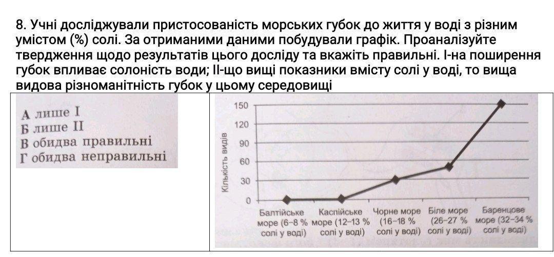 8. Учні досліджували пристосованість морських губок до життя у воді з різним умістом (%) солі. За отриманими даними побудували графік. Проаналізуйте твердження щодо результатів цього досліду та вкажіть правильні. І-на поширення губок впливає солоність води; ІІ-що вищі показники вмісту солі у воді, то вища видова різноманітність губок у цьому середовищі
