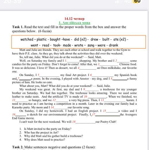"My weekend was great. At first, my dad and I **built** a treehouse for my younger brother on Saturday. We had fun together. The treehouse looks amazing. There we used some leather to make seats. And the artificial TV is made of **plastic**. And we were so hungry, and we **ate** a very big pizza. Then, when we finished, we **took** karate. I need to practice as I am having a competition in a month. Later in the evening our family had a Karaoke party. My mom and **sang** our favorite song."