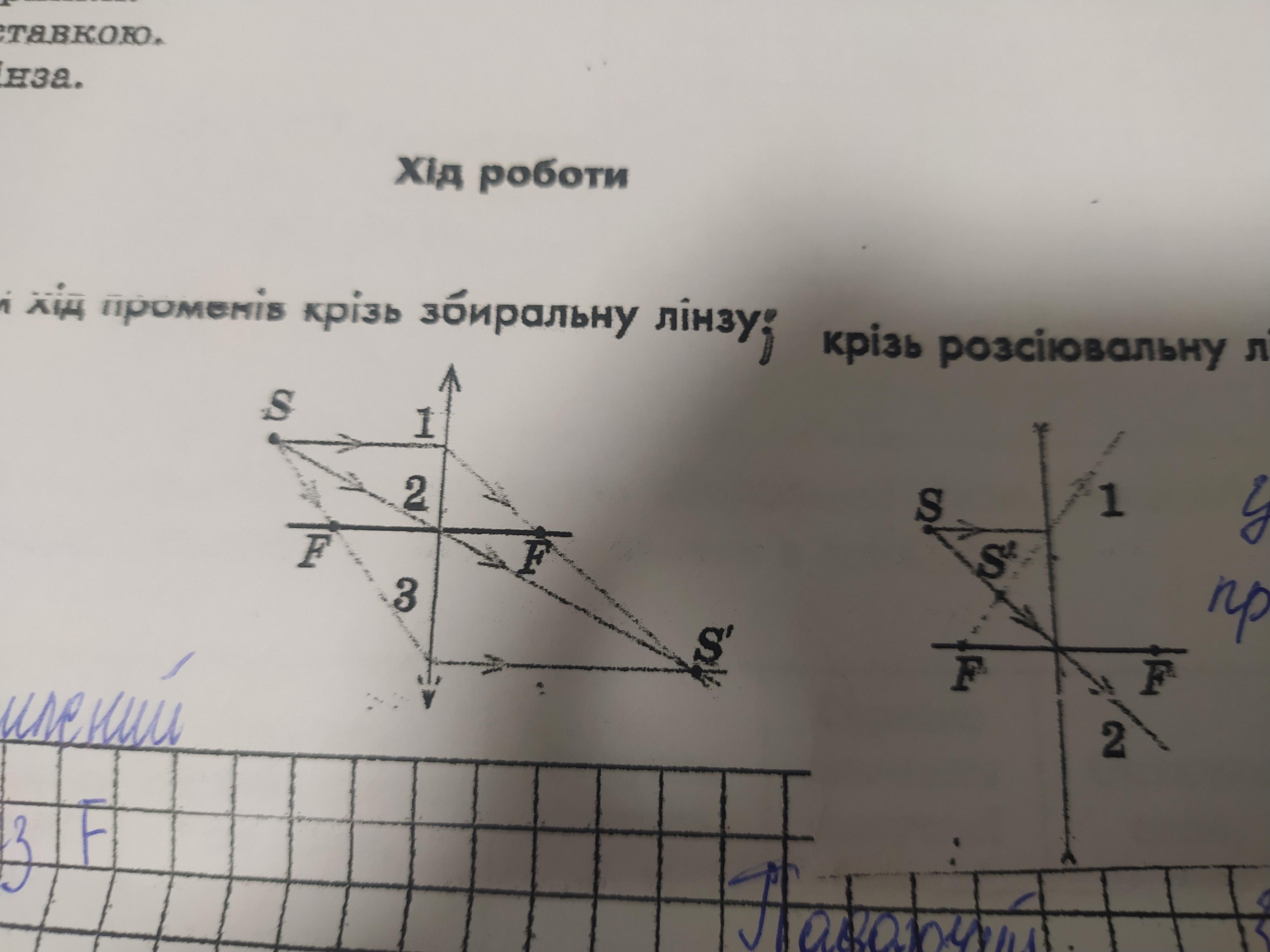 3 промінь проходить через фокус, тому після заломлення йде паралельно головній оптичній вісі.