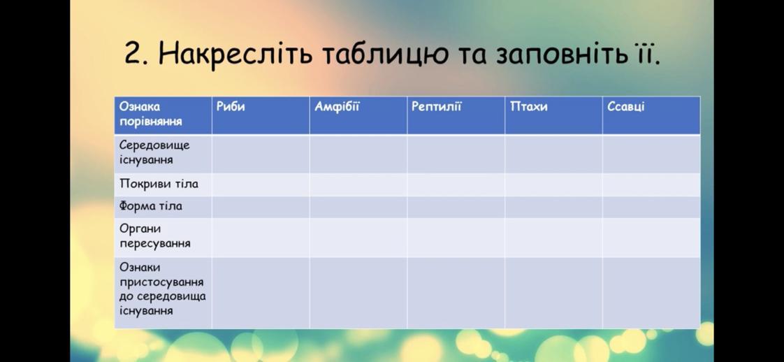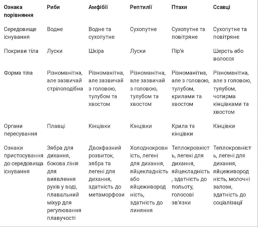 Відповідь: Покрив тіла. риби: представлені шкірою з лускою(покриви тіла), амфібії: гладеньку тонку шкіру, яка порівняно легко проникна для рідин і газів(покрив тіла), рептилії: Зовнішній шар покривів плазунів, на відміну від земноводних, роговіє. Шкіра суха, практично без залоз, вкрита роговими лусками, щитками або пластинками - похідними покривного епітелію(покрив тіла), птахи: вкрите пір'ям(покрив тіла), ссавці: складається з двох шарів: зовнішнього — епідермісу і внутрішнього — дерми, або власне шкіри(покрив шкіри).