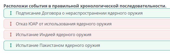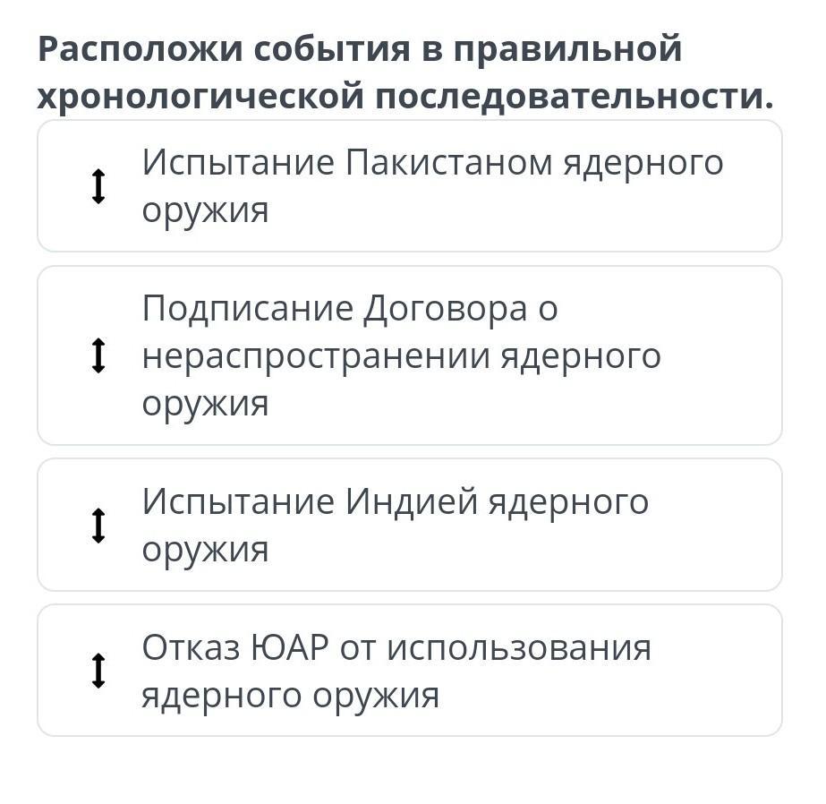 Расположи события в правильной хронологической последовательности. Испытание Пакистаном ядерного оружия