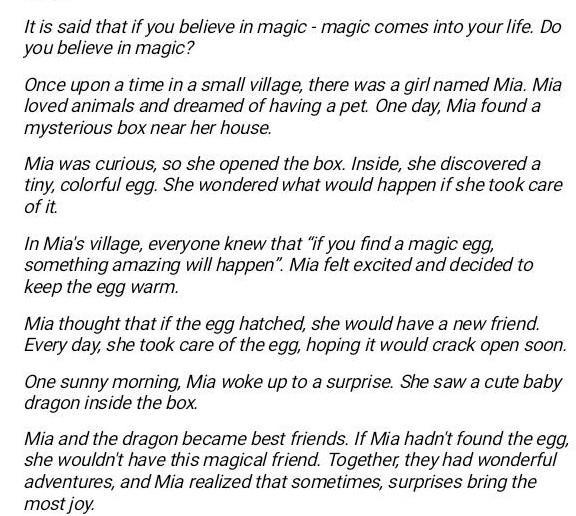 Task 2. Answer the questions about the text 1. What did Mia find near her house in the small village? 2. Why was Mia excited about the egg she found? 3. In Mia's village, what did everyone know about finding a magic egg? 4. Why did Mia decide to keep the egg warm? 5. What was Mia's surprise when she woke up one sunny morning? 6. How did Mia feel about her new friend, and what did they do together?