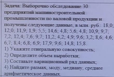 Задача: Выборочно обследование 30 предприятий машиностроительной промышленности по валовой продукцин и получены следующие данные, в млн руб.: 18,0 12,0; 11,9; 1,9; 5,5; 14,6; 4,8; 5,6; 4,8; 10,9; 9,7; 7,2; 12,4; 7,6; 9,7; 11,2; 4,2; 4,9; 9,6; 3.2; 8,6; 4,6; 6,7; 8,4; 6,8; 6,9; 17,9; 9,6; 14,8; 15.8. 1) Укажите генеральную совокупность; 2) Определите объем выработкн 3) Составьте варнационный ряд данных; 4) Найдите размах, моду, медиану, среднее дам 99б