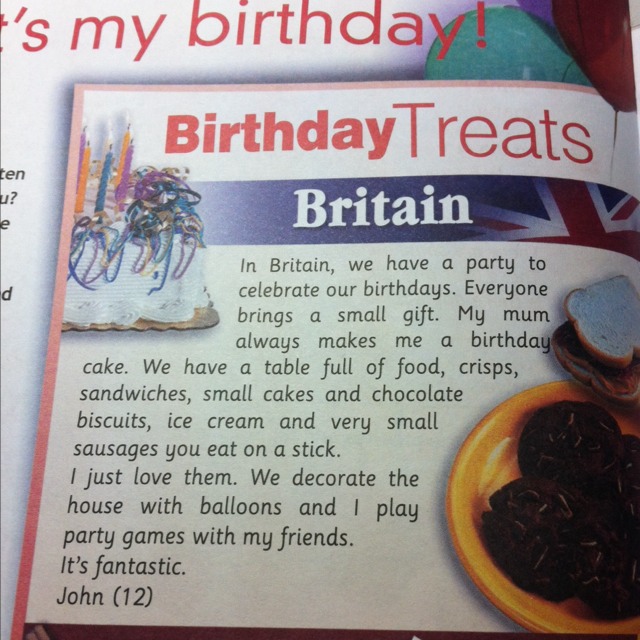 Translate: В Британии мы устраиваем вечеринку ко Дню Рождения. Все приносят маленькие подарки. Моя мама всегда делает на мой День Рождения торт. У нас на столе много еды: чипсы, сэндвичи, пирожные и шоколадный бисквит, мороженое и очень маленькие ломтики колбасы, которые ты можешь есть палочками. Я люблю их. Мы украшаем дом воздушными шарами и я играю в игры с моими друзьями. Это волшебно.