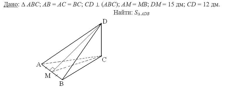 S(ADB) =1/2 AB DM =3√3 *15 =45√3 (дм^2)