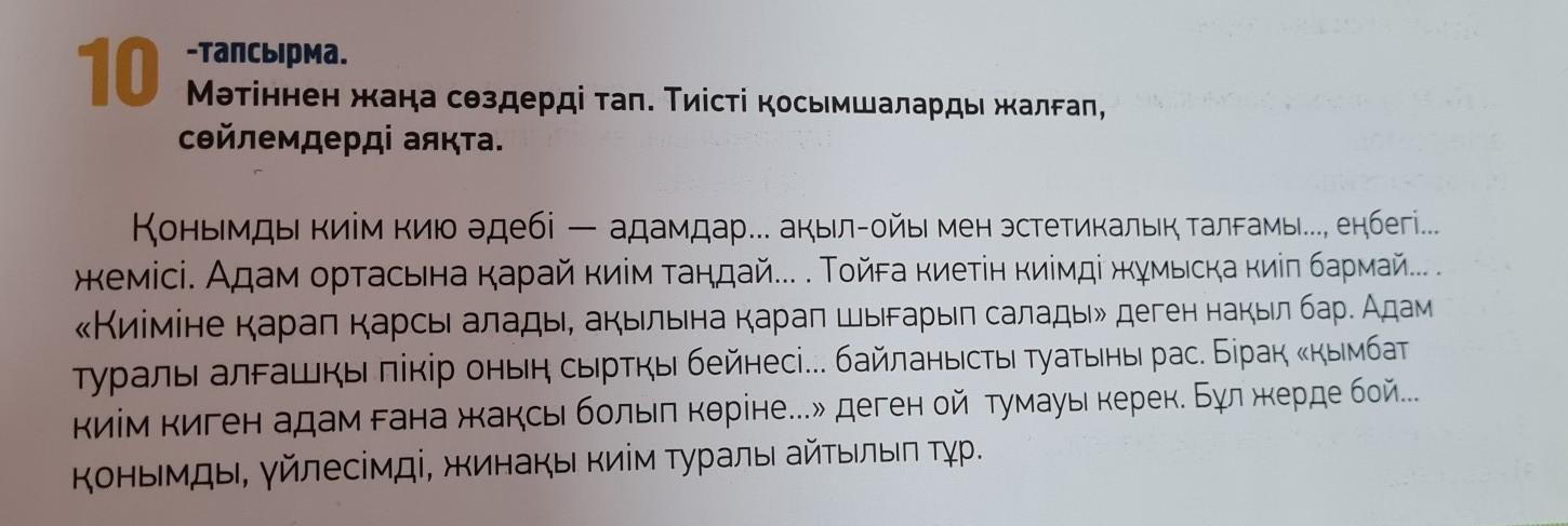 ЖАЗЫЛЫМ 10 -тапсырма. Мәтіннен жаңа сөздерді тап. Тиісті қосымшаларды жалғап, сөйлемдерді аяқта. Қонымды киім кию әдебі адамдар... ақыл-ойы мен эстетикалық талғамы..., еңбегі... жемісі. Адам ортасына қарай киім тандай.... Тойға киетін киiмдi жумыска киiп бармай..... «Киіміне қарап қарсы алады, ақылына қарап шығарып салады» деген нақыл бар. Адам туралы алғашқы пікір оның сыртқы бейнесi... байланысты туатыны рас. Бірак «кымбат киім киген адам ғана жақсы болып көріне...» деген ой тумауы керек. Бұл жерде бой... конымды, үйлесімді, жинақы киім туралы айтылып тұр. -