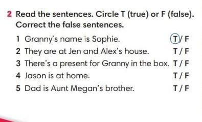 2 Read the sentences. Circle T (true) or F (false). Correct the false sentences. 1 Granny's name is Sophie. T/F 2 They are at Jen and Alex's house. T/F 3 There's a present for Granny in the box. T/F 4 Jason is at home. T/F 5 Dad is Aunt Megan's brother. T/F 5 Why? a Th c Th