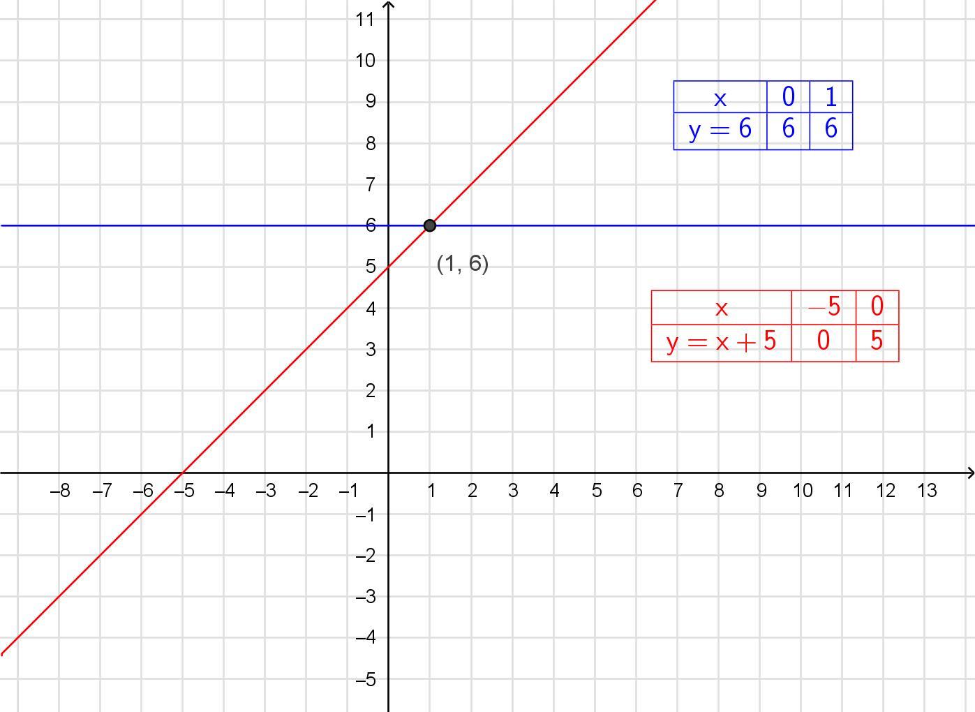 Побудуйте в одній системі координат графіки функцій y=6 і у=х+5 та визначте координати точок їхнього перетину.