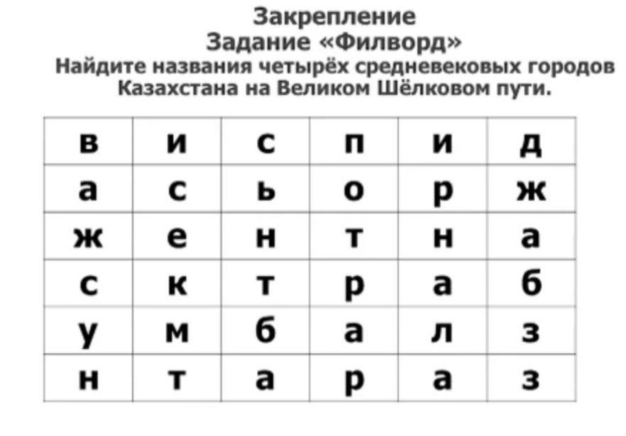 филворд названия четырех средневековых городов Казахстана на Великом Шелковом пути ДАМ 75 БАЛЛОВ СРОЧНО