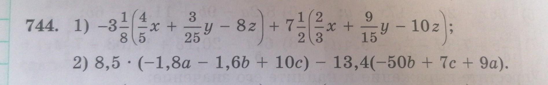 1/4 9 (12 Y - 82 + 3 25 2) + 7 ²1 (²/3x + 1/5 V - 10₂); y 85 23 2) 8,5 - (-1,8a - 1,6b+10c) - 13,4(-506 + 7c+ 9a). 744. 1) -8