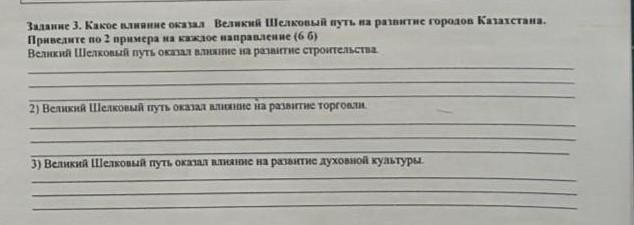 Задание 3. Какое влияние оказал Великий Шелковый путь на развитие городов Казахстана. Приведите по 2 примера на каждое направление (66) Великий Шелковый путокал влияние на развитие строительства 2) Великий Шелковый путь оказал влияние на развитие торговли. 3) Великий Шелковый путь оказал влияние на развити духовной культуры