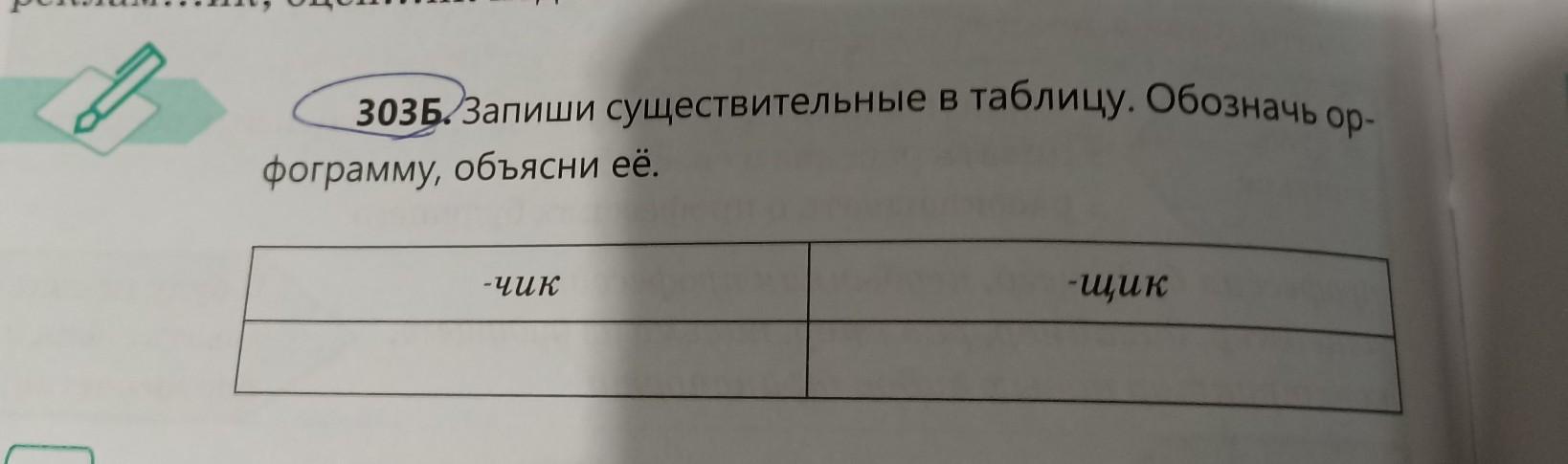 303Б. Запиши существительные в таблицу. Обозначь ор- фограмму, объясни её. -чик -щик