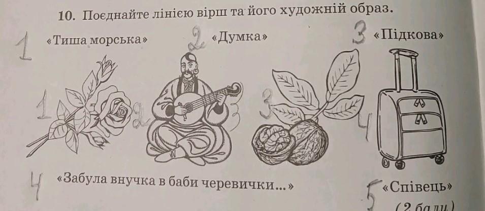1 10. Поєднайте лінією вірш та його художній образ. «Тиша морська» > 3 «Підкова» «Співець» даю 60 балов