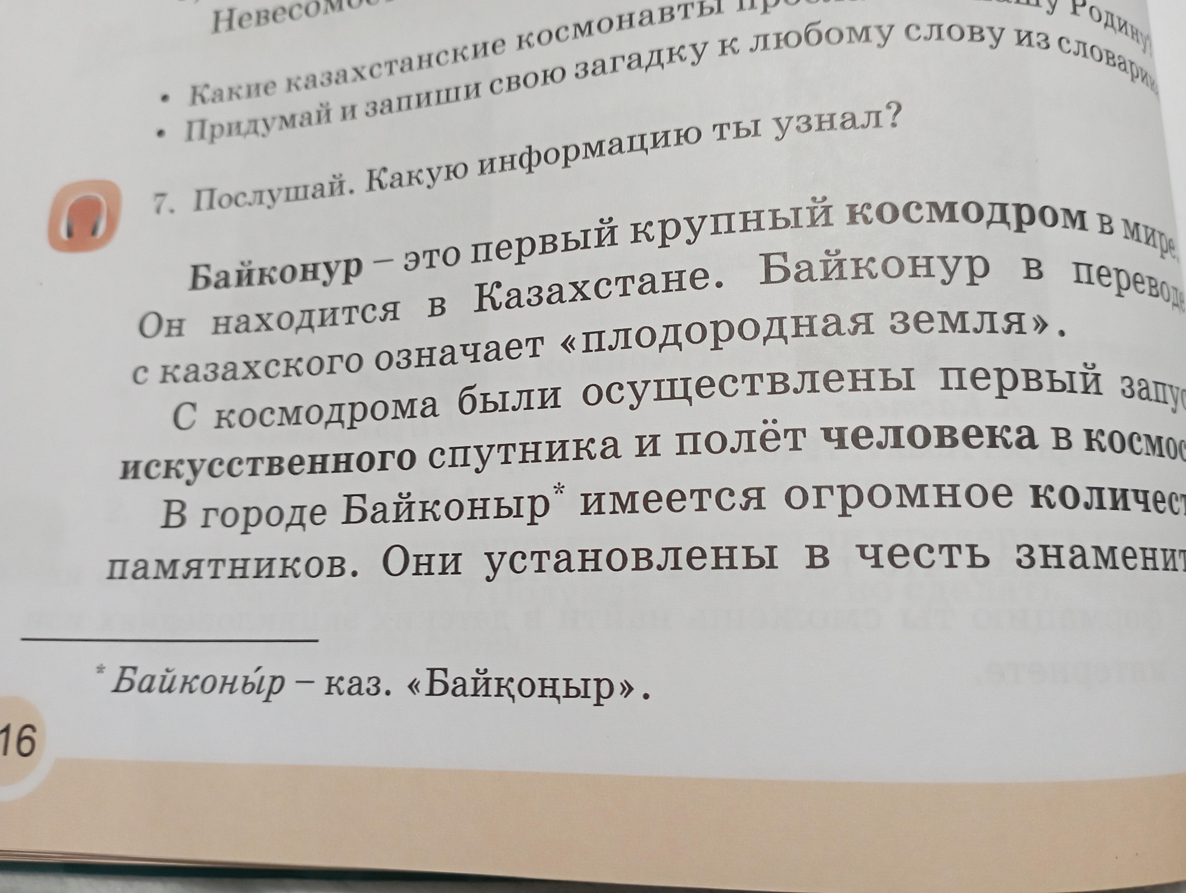 7. Послушай. Какую информацию ты узнал? Байконур - это первый крупный космодром в мире. Он находится в Казахстане. Байконур в переводе с казахского означает «плодородная земля». С космодрома были осуществлены первый запуск искусственного спутника и полёт человека в космос. В городе Байконыр" имеется огромное количество памятников. Они установлены в честь знаменитых ' Байконыр - каз. «Байконыр». бтях учёных и исследователей космоса, которые прослави- ли этот край. • Выбери пословицу, которая подходит к тексту. Народы нашей страны дружбой сильны. Жигита доля - за Родину стоять. Главное в жизни - прославлять Отчизну. • Выпиши из текста выделенные словарные слова. Поставь знак ударения.