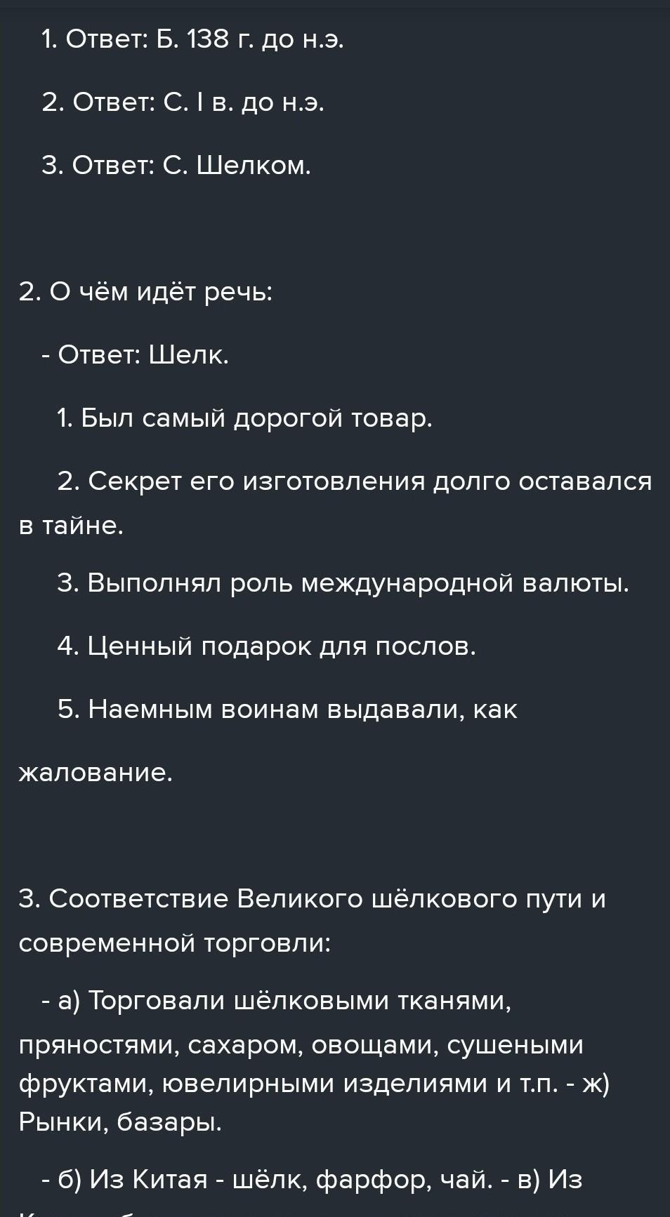 1.Реши тест. 1. В каком году из Китая вышел посольский караван, посланный императором У-Ди в неведомые страны на западе: А.130 г. до н.э. В.138 г. до н.э. С.148 г. до н.э. 2.Какую дату принято считать началом регулярного действия Великого Шёлкового пути в исторической науке: А. П в. до н.э. В. ІІ в. С. І в. до н.э. 3.Одаривали царей и послов, выплачивали жалованье наёмному войску и государственные долги золотом и: А. Деньгами В. Оружием С. Шелком 2. О чём идёт речь? 1.Был самый дорогой товар. 2.Секрет его изготовления долго оставался в тайне. 3. Выполнял роль международной валюты. 4.Ценный подарок для послов. 5.Наëмным воинам выдавали, как жалование. OTBET: 3. Установи соответствие. Великий шёлковый путь Современная ТОРГОВЛЯ a) Торговали шёлковыми тканями, пряностями, сахаром, овощами, сушеными фруктами, ювелирными изделиями и т.п. б) Из Китая - шёлк, фарфор, чай. в) Из Китая - бытовая техника, одежда, игрушки, оборудование. г) Путь охватывал Южную территорию Казахстана. Д) Торговые пути опутали весь мир. e) Торговали китайские, арабские персидские купцы. ж) Распространение ислама, буддизма, христианства. 3) Товар покупается и продаётся за денежные единицы: рубли, тенге, доллары, юани, eBpo и др. и) Меновая торговля. к) Магазины, супермаркеты, бутики, рынки, павильоны, Интернет магазины. л) лавки, рынки, базары.