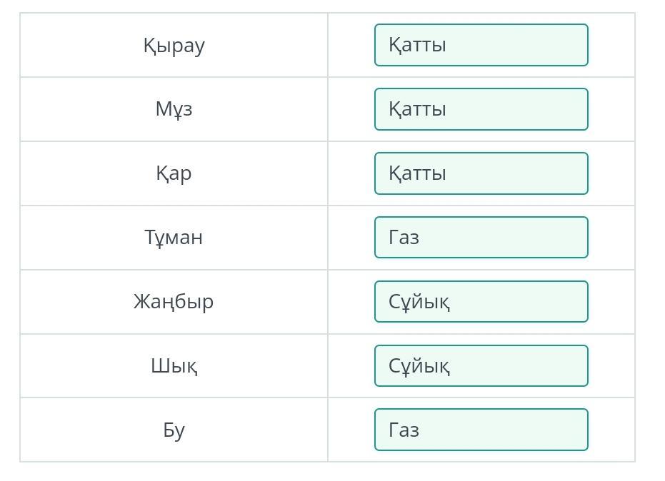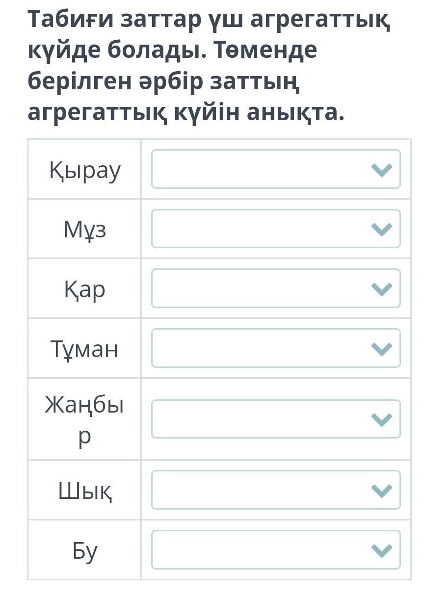 Табиғи заттар үш агрегаттық куйде болады. Төменде берілген әрбір заттың агрегаттық күйін анықта. Қырау Мұз Қар Тұман Жаңбы Шық Бу