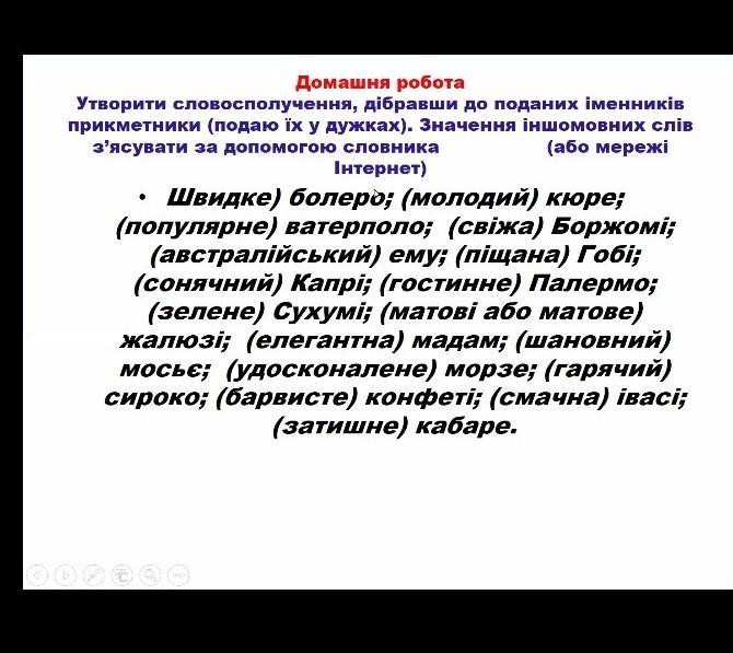 Утворити словосполучення, дiбравши до поданих іменників прикметники (подаю їх у дужках). Значення іншомовних слів з'ясувати за допомогою словника (або мережі Інтернет) Швидке) болеро; (молодий) кюре; (популярне) ватерполо; (свіжа) Боржомі; (австралійський) ему; (піщана) Гобі; (СОНЯЧНИЙ) Капрi; (гостинне) Палермо; (зелене) Сухумі; (матові або матове) жалюзi; (елегантна) мадам; (шановний) мосьє; (удосконалене) морзе; (гарячий) сироко; (барвисте) конфеті; (смачна) івасі; (затишне) кабаре.