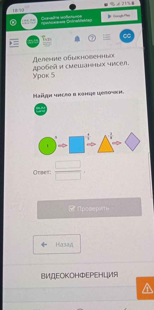 Деление обыкновенных дробей и смешанных чисел. Урок 5 Найди число в конце цепочки. BILIM Land Ответ: Проверить д
