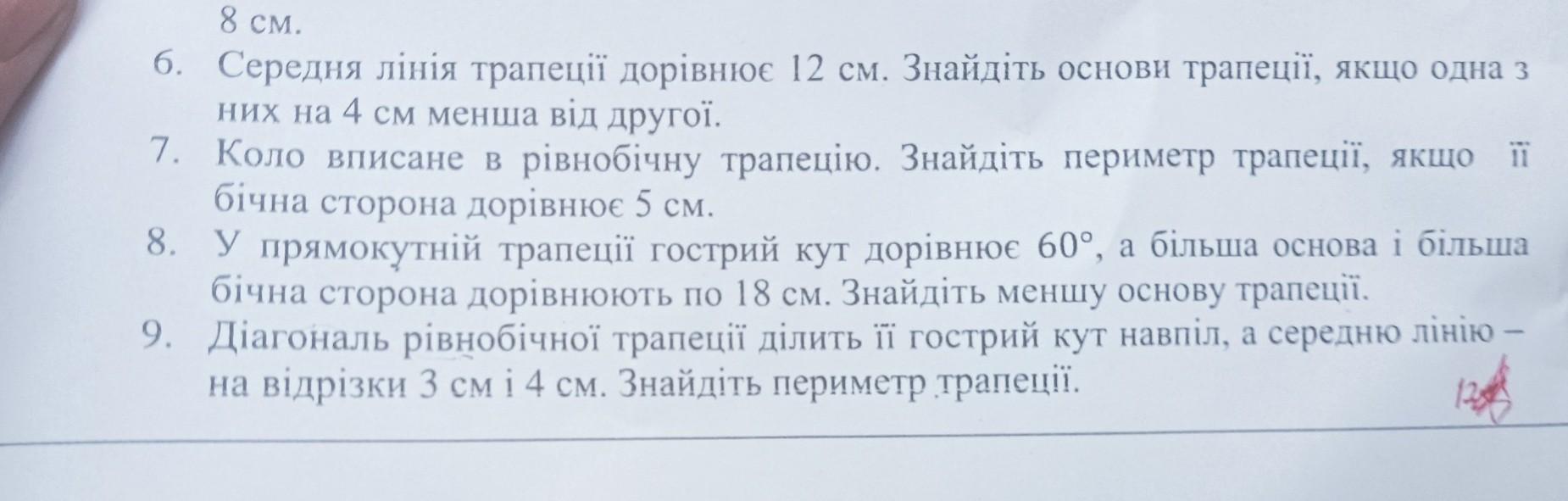 6. Сія трапеції дорівнює 12 см. Знайдіть основи трапеції, якщо одна з них на 4 см менша від другої. 7. Коло вписане в рівнобічну трапецію. Знайдіть периметр трапеції, якщо її бічна сторона дорівнює 5 см. 8. У прямокутній трапеції гострий кут дорівнює 60°, а більша основа і більша бічна сторона дорівнюють по 18 см. Знайдіть меншу основу трапеції. Діагональ рівнобічної трапеції ділить її гострий кут навпіл, а середню лінію - на відрізки 3 см і 4 см. Знайдіть периметр трапеції. 9.